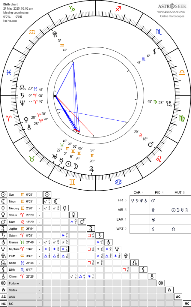 Have a great time. Uranus is a little bit close so don’t be surprised about surprises there’s still room for that. Regardless there’s lots of fire 🔥 in this chart and fire works well with air (Gemini). Gemini conjunct moon ♊️ in trine with Pluto in Aquarius is auspicious for communities and connections. There’s a strong basis for active harmony right now.